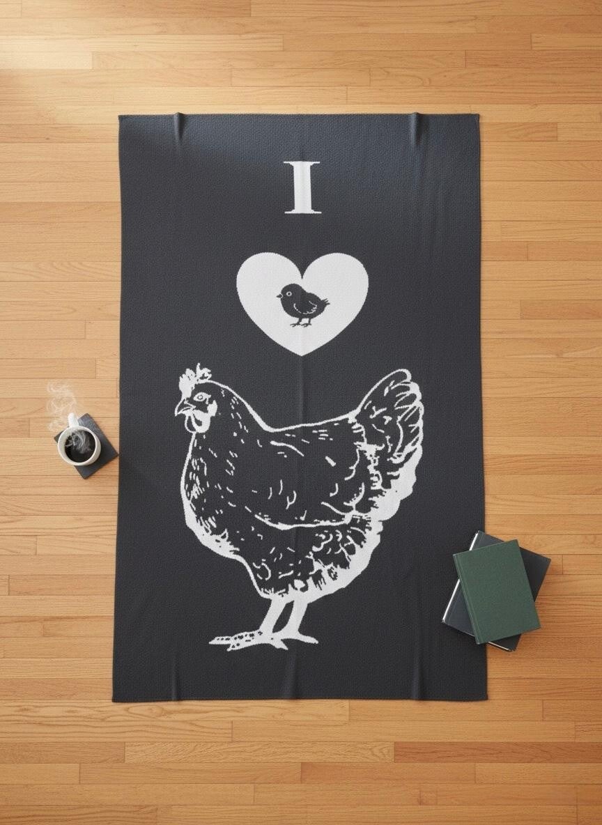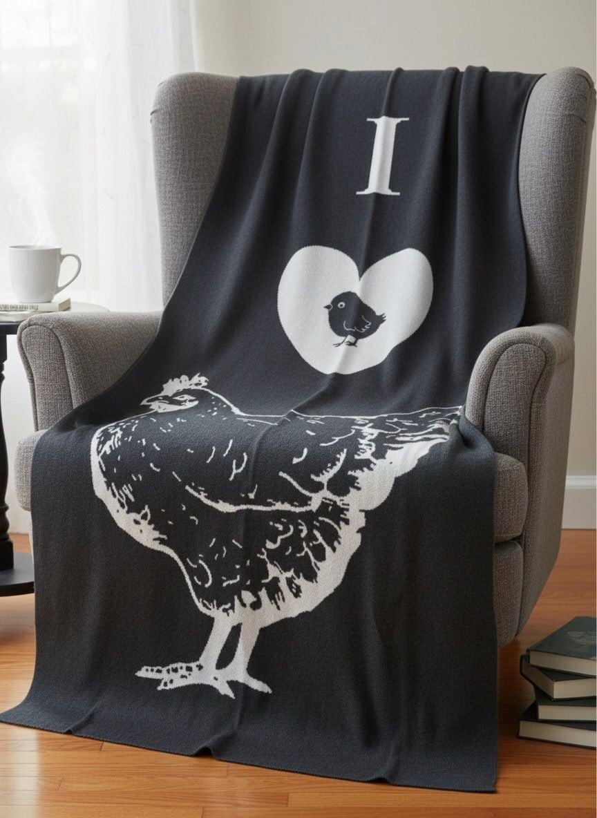 Cozy 100% organic cotton REVERSIBLE throw with "I LOVE CHICKEN" inspiration.